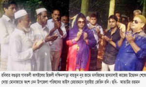 কাগইল (বগুড়া) প্রতিনিধিঃ গতকাল রবিবার বগুড়ার গাবতলী কাগইলের হিজলী দক্ষিনপাড়া বায়তুন নূর জামে মসজিদের ছাদ ঢালাই কাজের উদ্বোধন শেষে দোয়া মোনাজাতে অংশ নেন উপজেলা পরিষদের ভাইস চেয়ারম্যান মোছাঃ সুরাইয়া জেরিন রনি। এ সময় উপস্থিত ছিলেন কাগইল নায়েব উল্যা সিনিয়র আলিম মাদ্রাসার অধ্যক্ষ আব্দুল মজিদ, শিক্ষক আইযুব আলী, সমাজসেবক লুৎফর রহমান, আব্দুল বারী, হায়দার আলী, হারুন, ডাঃ আবুজার, ধলু, জাফর, আইনুর, রেজাউল, বাবলু, সবুজ, আরিফুল, ইউনুছ, জাহিদুল, মেহেদুল, শাহাবুদ্দিন, সাহাদত, ফারুক, মিনারুল, ইউসুফ প্রমূখ। মসজিদটি নির্মানের জন্য বগুড়া-৭ (গাবতলী এলাকার) এমপি এড্যাভোকেট মুহাম্মাদ আলতাফ আলী ২০হাজার টাকা ও ২টি সোলার প্রদান করেছেন। উদ্বোধন কালে উপজেলা পরিষদের ভাইস চেয়ারম্যান সুরাইয়া জেরিন রনি মসজিদের নির্মান কাজের জন্য ১০হাজার টাকা বরাদ্দ প্রদানের ঘোষনা দেন। এরপর তিনি গ্রামবাসীর সঙ্গে সৌজন্যে সাক্ষাতকালে শুভেচ্ছা ও মতবিনিময় করেন।